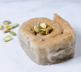 Rollo de masa filo, relleno de pistachos, con un toque de almibar